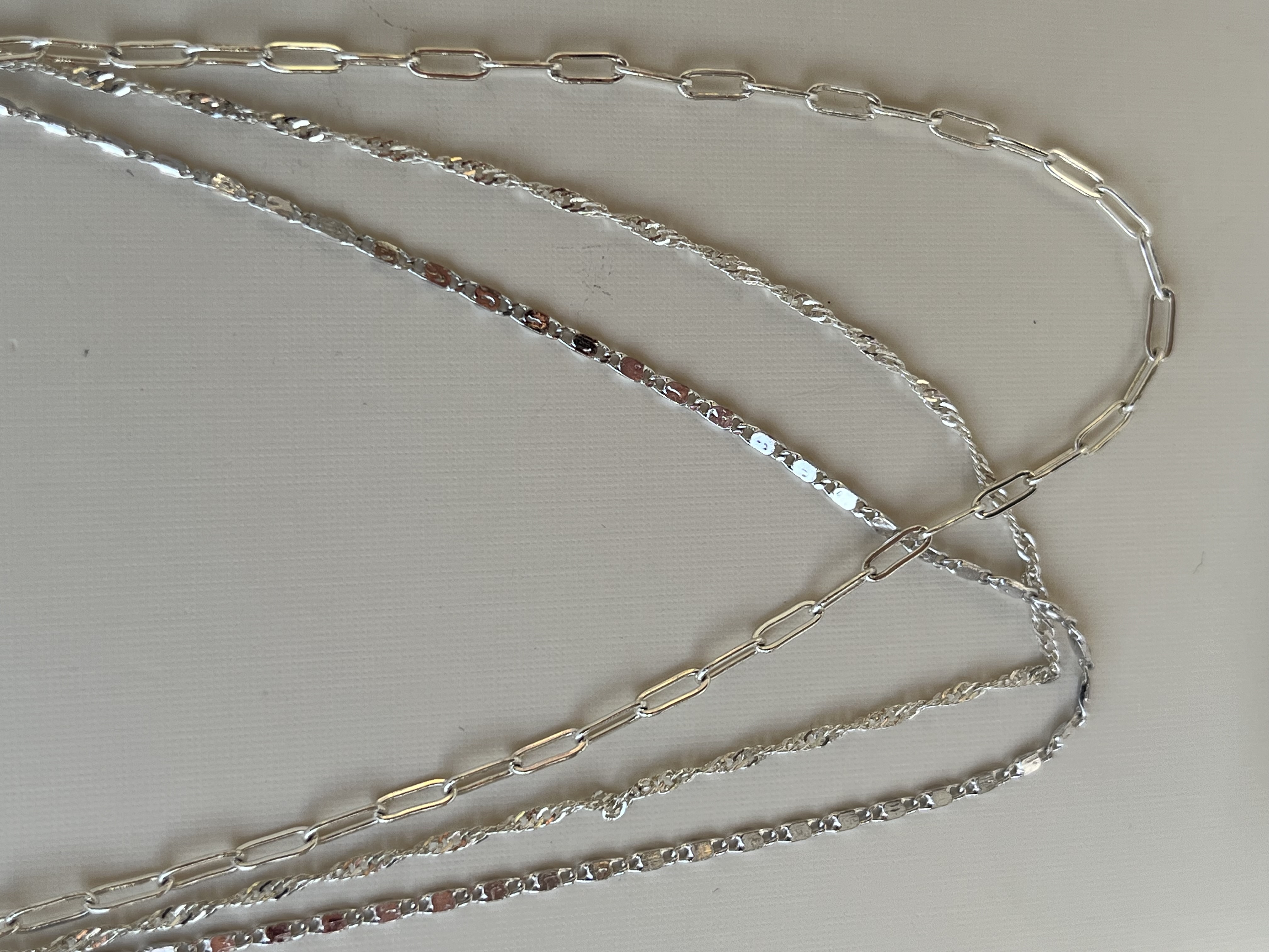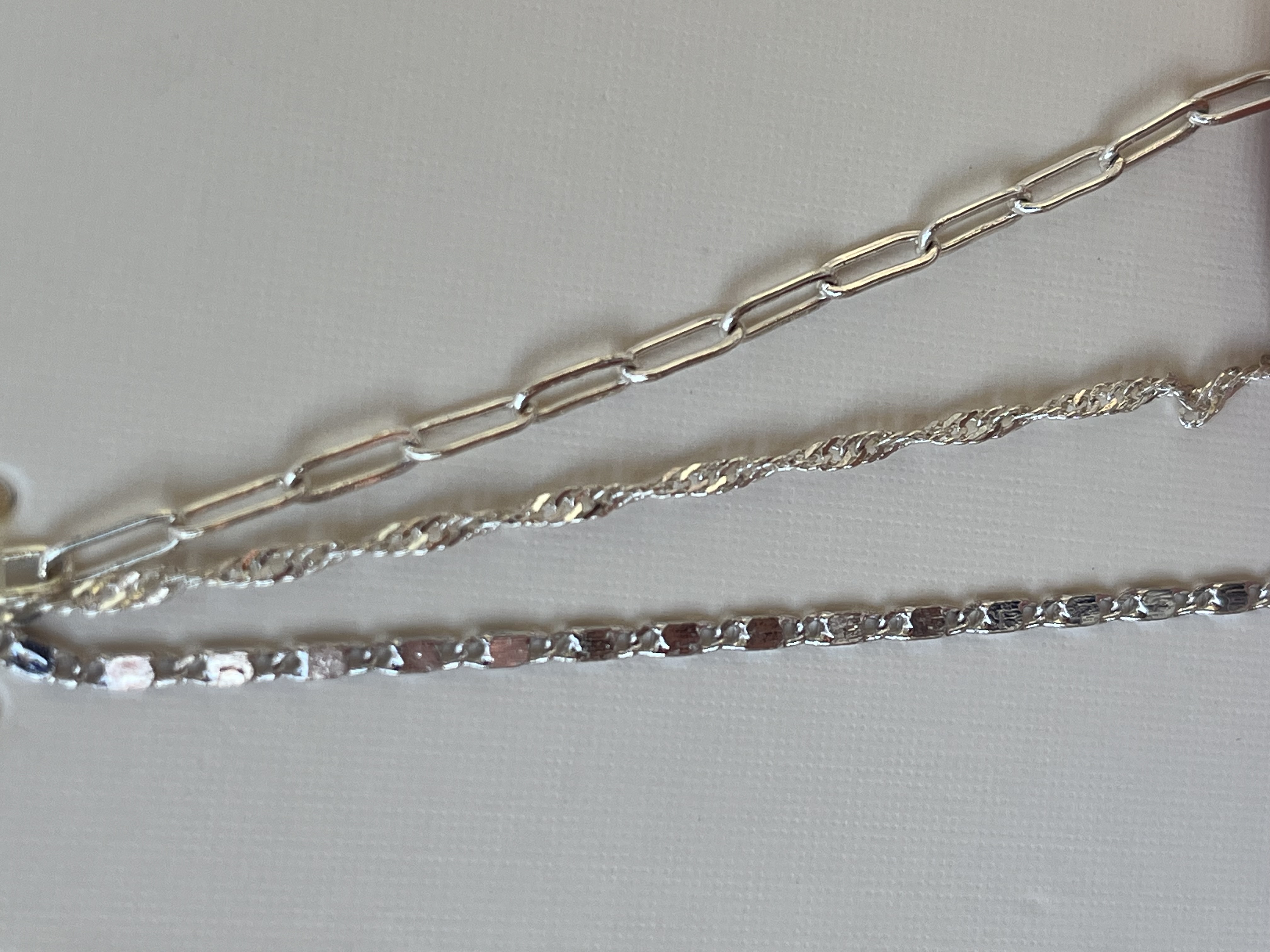 ✨گردنبند سه لاین آبکاری نقره ترند برند آی ام✨ استیل ابکاری نقره کیفیت فوق العاده بالا▫️ رنگ ثابت و دوام بسیار بالا🤍 ضد حساسیت و مناسب روزمره▫️ قیمتش ۱۲ دلار هس روش خورده ولی تو تخفیف گذاشتیم🤍